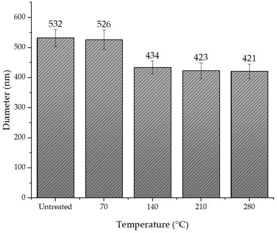 The diameters at 210 °C and 280 °C were 423 ± 21 nm and 421 ± 24 nm, respectively. Figure 6 shows the relationship between nanofiber diameter and annealing. Based on the calculated p-values, it was concluded that at a significance level of 0.05, there was a significant difference between the diameter values of the nanofiber mat annealed at 70 °C and 140 °C.
