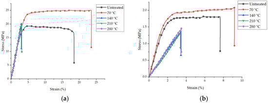 Figure 7a,b shows the stress (σ)–strain (ε) graphs of the specimens of the untreated PAN nanofiber mats and the nanofiber mats after annealing in the longitudinal and transverse directions, respectively, while Table 1 represents the average values. During the tensile test, the slight clamping pressure prevented any failure of the specimens in the grips. The stress–strain graphs reveal that the strength of the annealed PAN nanofiber mat at 70 °C was greater than that of the untreated PAN nanofiber mat. The tensile strength of an untreated PAN nanofiber mat was 19.1 ± 3 MPa, while Young’s modulus was 610 ± 30 MPa. Instantaneous peaks in tensile strength and Young’s modulus of an annealed PAN nanofiber mat at 70 °C were 154 ± 5 MPa and 25.2 ± 2 MPa, respectively. Elongation at break increased from 18.2 ± 2 to 23.6 ± 2%. All PAN nanofiber mats annealed above glass transition temperatures of 90 °C exhibited constant decreases in tensile strength, Young’s modulus, and elongation at break. The PAN nanofiber mat annealed above the glass transition temperature of 140 °C showed a tensile strength of 19.5 ± 1 MPa, Young’s modulus of 598 ± 26 MPa, and an elongation at break of 3.1 ± 0.2%. At 210 °C and 280 °C, the tensile strength values of the annealed PAN nanofiber mats were 19.7 ± 1 MPa and 16.8 ± 1 MPa, and Young’s modulus values were 595 ± 24 MPa and 596 ± 23 MPa, respectively. The changes in the mechanical properties of the nanofibers when untreated and annealed at 70 °C were statistically significantly different. The thickness of the nanofiber mat annealed at 140 °C decreased significantly from 154 ± 5 µm to 121 ± 5 µm. A similar trend was also observed in the transverse direction: tensile strength at 70 °C increased by 23%, and elongation at break increased by 21%, whereas the elastic modulus increased by 18%.