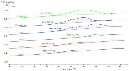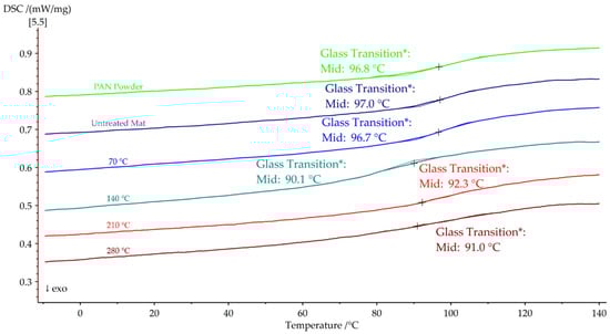 The second heating cycle of PAN in the DSC is depicted in Figure 10. The glass transition temperature of PAN powder was initially observed at 96.8 °C. Similarly, the untreated nanofiber mat and the nanofiber mat annealed at 70 °C exhibited glass transition temperatures within a similar range, at 97.0 °C and 96.7 °C, respectively. Notably, nanofiber mats that were annealed above the glass transition temperature displayed a significant decrease in the glass transition temperature. Specifically, the nanofiber mats annealed at 140 °C, 210 °C, and 280 °C exhibited glass transition temperatures of 90.1 °C, 92.3 °C, and 91.0 °C, respectively.
