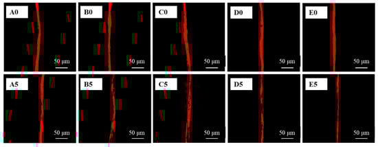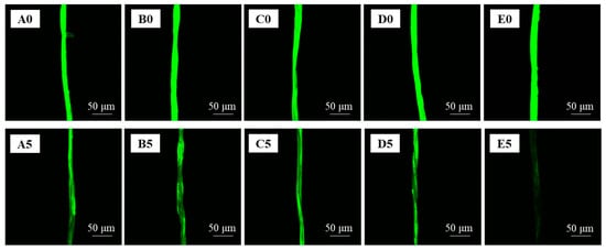 CLSM Images of cotton fibers before and after washing. (A): water; (B): AEO-9; (C): LAS; (D): LAS/AEO-9 (1:1 wt%); and (E): Tide Free. 0: unwashed; 5: washing for 150 s.