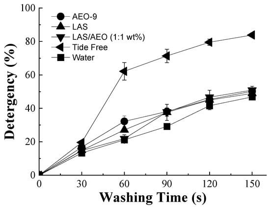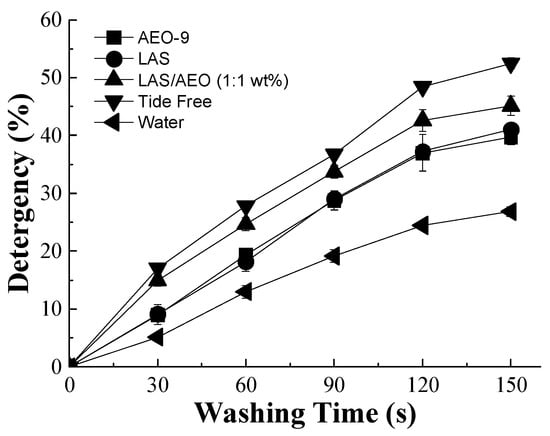To quantify the oil removal efficiency of different detergents, the percentage of RFI variation was calculated using Image-Pro Plus and plotted against the washing time, as depicted in Figure 3. It was shown that the percentage of detergency was in the order of Tide Free > LAS/AEO-9 (1:1 wt%) > LAS > AEO-9 > water. The percentage of the detergency of LAS and AEO-9 was calculated to be 39.7% and 41.0% in 150 s, respectively, while water could only remove 25% of oil. Compared to a single surfactant solution, the compounded solution of LAS and AEO-9 exhibited a higher percentage of detergency (~44%). In the latter case, the solubilization was significantly increased due to the decreased surface tension in the compounded system [,]. Similarly, the commercial detergent (Tide Free) containing multiple components (anionic and nonionic surfactants, enzymes) presented the highest oil removal efficiency, since the fluorescent intensity decreased to as low as 48% after washing for 150 s. This result highlights the feasibility and practicality of the proposed CLSM method for the detergency determination of a single polymeric fiber.