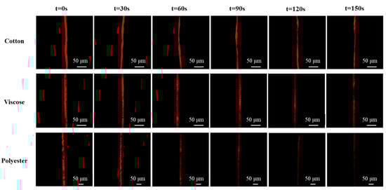 The confocal laser scanning microscope (CLSM) (Nikon Eclipse CI, Tokyo, Japan) was used to image the soybean oil and pure milk removal process from single polymeric fibers. The excitation and emission wavelengths were set at 543.5 nm and 650 nm for Nile Red [], and 488 nm and 543.5 nm for FITC, respectively. The magnification of single cotton and viscose fibers was 400×, while that of single polyester fiber was 200×. The as-prepared single polymeric fibers before and after washing were observed by CLSM, and the fluorescence images were recorded after every 30 s of washing.
