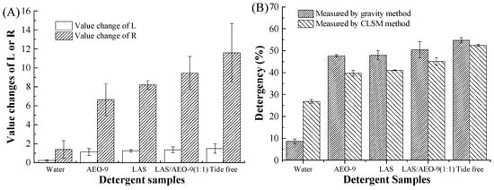 Detergency of detergents in single cotton fiber using different measurements. (A) Value changes of L and R; (B) detergency measured by gravity method and CLSM imaging method.
