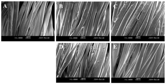 SEM images of cotton fabrics. (A): Unsoiled area; (B,C): soiled area before laundry; (D,E): soiled area after laundry with water; (D): and the commercial detergent (Tide Free) (E).
