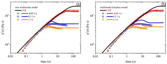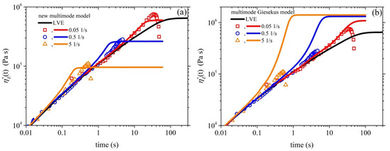 (a) Model prediction of the growth of the shear viscosity prediction (lines) upon the inception of the shear flow at three different dimensionless shear rates, along with comparison with the experimental data (symbols) considered in Ref. [15]. In panel (b), we depict the same comparison for the multimode Giesekus model. The thick black line depicts the LVE envelope, which is shown in Equation (15a).