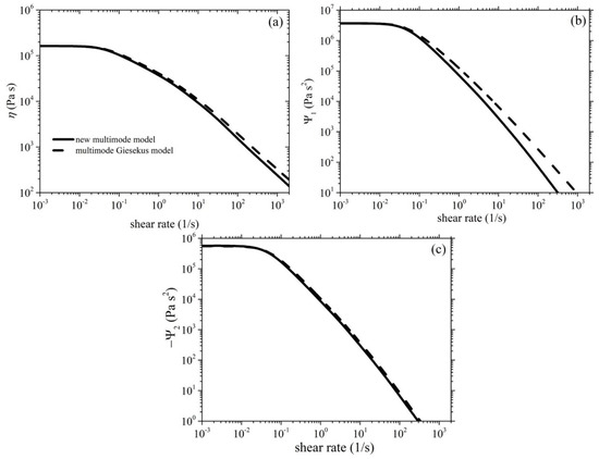 Model predictions of the steady-state (a) shear viscosity and the (b) first and (c) second normal stress coefficients of the HDPE-1 sample. The parameter values are the same as those used in Figure 2. The multimode Giesekus model prediction is also depicted (black dashed lines).