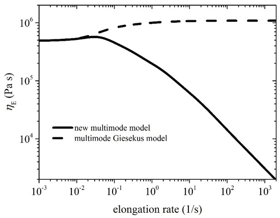 Model prediction of the steady-state uniaxial elongational viscosity. The parameter values are the same as those used in Figure 2 except ξ = 0. The multimode Giesekus model prediction is also depicted (black dashed line).