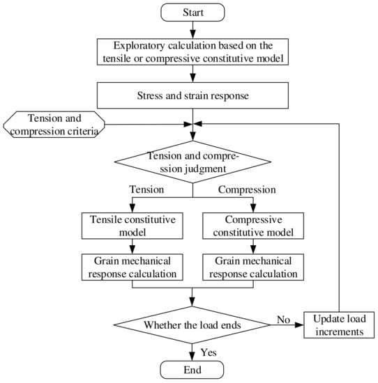 Therefore, a novel method for grain structural integrity assessment considering the tension–compression asymmetry of a propellant’s mechanical properties was proposed in this paper. In specific, the average principal stress at every Gaussian point () is used to determine the tensile/compressive state of the propellant grain and the tensile/compressive constitutive model parameters are assigned accordingly to each Gaussian point of a finite element model (FEM). This method can fully consider the influence of tension–compression asymmetry in a propellant’s mechanical properties on the grain structural integrity, and it has lower element numbers, degrees of freedom and computational workload with good convergence. Furthermore, it preserves the fundamental features of conventional FEMs, such as universality and program consistency, while exhibiting robust flexibility towards intricate geometries and diverse physical quandaries. The specific process is shown in Figure 1.