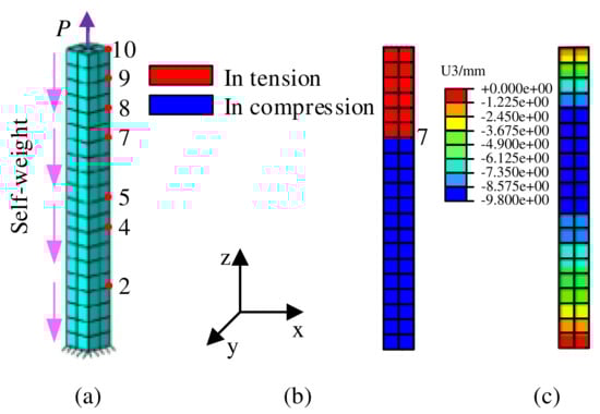 A bimodular bar subjected to a tensile force and self-weight, as shown in Figure 2a, is used to verify the proposed method in this paper []. In Figure 2a, the rest length of the bar is 10 m, the area of cross section is 1 m × 1 m, the self-weight of the material per unit volume is , and the load parameters are . Eighty 8-node brick elements are used to discretize the 3D column. Four cases were analyzed: (i) ; (ii) , ; (iii) , ; and (iv) , .