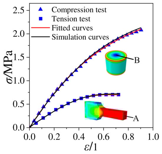 The unified constitutive equations for the NEPE propellant under tension and compression is validated against the experimental data (Figure 3) obtained from Refs. [,]. Based on the three-dimensional damage constitutive model derived in Section 3.2, the ABAQUS UMAT (ABAQUS ver. 2022, Simulia; Dassault Systemes, Vélizy-Villacoublay, France) subroutines were developed and the stress–strain curves of the tensile specimens under different confining pressures were predicted. The stress–strain simulation curves of the samples were obtained by selecting point A of the tension sample and point B of the compression sample, and compared with the experimental curves and fitted curves, as shown in Figure 3. It is clear that the prediction results are in good agreement with experimental data and support that the unified constitutive equations reasonably well captures the stress–strain response of the NEPE propellant under tension and compression loads.