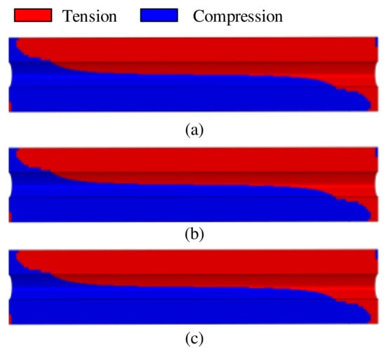 When examining the mechanical states of the propellant only in terms of tension or compression constitutive model, the boundary between the tension and compression regions of the propellant grain is illustrated in Figure 6b,c, respectively. Interestingly, the boundaries of tension and compression regions in the propellant grain are almost identical under all three mechanical states. This indicates that the boundary between tension and compression regions is independent of the propellant constitutive behavior.