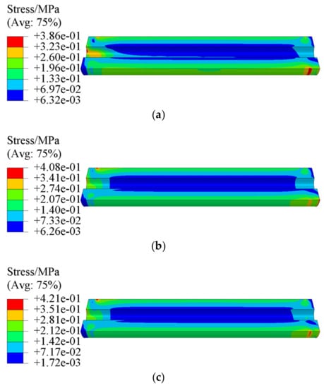 Figure 7 and Figure 8 present the equivalent stress and equivalent strain of propellant grain under the combined axial and transverse overloads, respectively. It is clear that the critical location is at the root of stress-release boot. The maximum equivalent stress of the propellant grain obtained via tension–compression asymmetry, and tension and compression constitutive model are 0.386 MPa, 0.408 MPa, and 0.421 MPa, respectively, while the maximum equivalent strain is 0.154, 0.193 and 0.1, respectively.