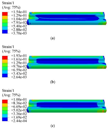 Equivalent strain contours of the grain: (a) tension–compression asymmetry unified constitutive model, (b) tension constitutive model, (c) compression constitutive model.