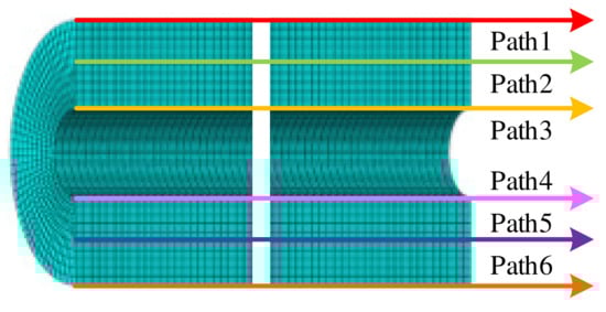 For further study the effect of tension–compression asymmetric mechanical behavior of the propellant on the mechanical response of the propellant grain under the combined axial and transverse overloads, six paths, as shown in Figure 9, were selected for analysis.
