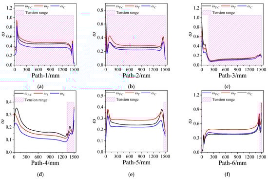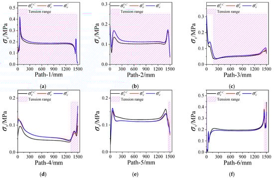 Figure 10 presents the equivalent stress of propellant grain along paths 1~6. The shaded area represents the propellant in a tension state when considering tension–compression asymmetry. It can be seen that the near the case is generally higher than that near the inner hole. There is no significant difference between the (the equivalent stress obtained via the tension constitutive model) and (the equivalent stress obtained via the compression constitutive model), except the critical location. However, there is a certain difference in the (the equivalent stress obtained via the tension–compression asymmetry unified constitutive model) when considering the tension–compression asymmetry.