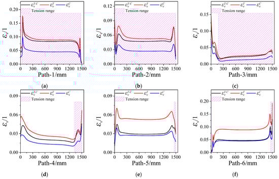 Equivalent strains vary along paths 1~6. (a) Path-1. (b) Path-2. (c) Path-3. (d) Path-4. (e) Path-5. (f) Path-6.