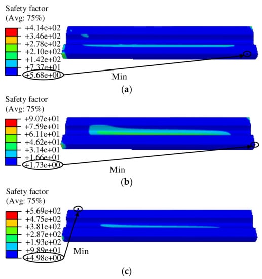 Safety factor based on the equivalent stress criterion: (a) tension–compression asymmetry unified constitutive model, (b) tension constitutive model, and (c) compression constitutive model.