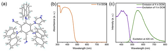 (a) The X-ray structure of 1, (b) the absorbance UV–Vis spectrum of 1 (0.1 mM) in dichloromethane (DCM), and (c) the excitation and emission curves of 1 (of 0.1 mM) in DCM.