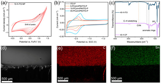 (a) CV curves of 10-1-ITO-NP in 0.1 M TBAPF6 and 1 mM of 1. Sweep rate 100 mV s−1, 10 sweeps, sweep range from −0.55 to 1.45 vs. Fc/Fc+. The dashed arrows indicate direction of peak potential shift as the sweep # increases. (b) CV (sweep rate 10 mV s−1; 5, 10, 45 sweeps; sweep range from −0.41 to −1.91 vs. Fc/Fc+) curves of 5, 10, and 45-1-ITO-NP compared with ITO-P in 0.1 M TBAPF6 acetonitrile solution without monomer. (c) FT-IR of 45-1-ITO and 45-1-CP. (d) Tilted SEM of 45-1-ITO and corresponding (e) C and (f) Sn EDX mapping on ITO glass.