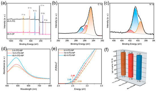 (a) XPS survey scans of 45-1-ITO and 45-1-CP and corresponding (b) C 1s and (c) N 1s of 45-1-ITO. (d) Reflectance UV–Vis of 5, 10, and 45-1-ITO-NP by reduction of the ITO-NP substrates. (e) Optical band gap of 5, 10, and 45-1-ITO-NP, and (f) LUMO and HOMO estimations.