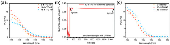 (a,c) IPCE tests of 5, 10, and 45-1-ITO-NP in 0.1 M NaClO4 dissolved in triple-distilled water containing 0.02 M hydroquinone (pH = 7.0) (neutral condition) or 0.5 M Et3N (pH = 12.6) (basic condition) at 0.25 V vs. SCE. (b) Stability test of 10-1-ITO-NP in the neutral condition under simulated AM 1.5G sunlight with UV-light filter.
