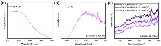 The 45-1-CP electrode was first soaked in distilled water for 2 h. Subsequently, the electrode was taken out of the water without drying, and its photoluminescence spectrum was immediately measured (Figure 5c). Afterwards, the electrode was exposed to aqueous solutions containing 10−4 M and 10−2 M LiClO4, respectively, for 120 min, and the photoluminescence spectrum was measured immediately as described above (Figure 5c).