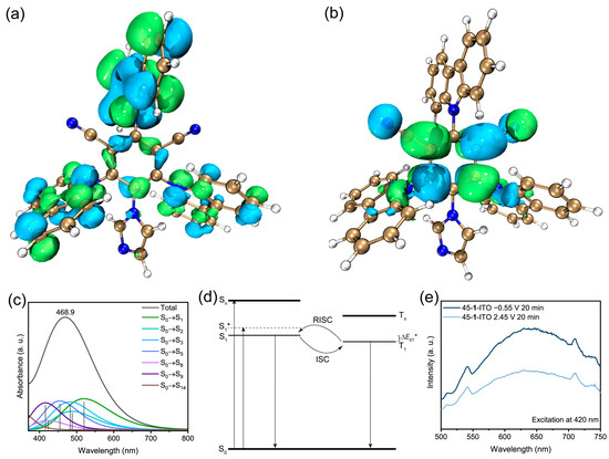 Preliminary time-dependent density functional theory (TD-DFT) calculations (Gaussian 16/B3LYP/6-31+G(d,p)) were carried out on 1 in the absence of solvent to provide insight into the photochemical processes reported in this paper. The calculated energy of the HOMO is −6.12 eV, and the energy of the LUMO is −3.08 eV, giving an energy gap of 3.04 eV. As shown in Figure 6a,b, the HOMO is localized on the carbazole groups, with the carbazole group between the cyano groups providing the highest contribution (LUMO, HOMO, and UV–Vis are drawn combined with Multiwfn [72] or VMD [73]). The LUMO is largely localized on the dicyanobenzene ring and roughly can be viewed as a π* aromatic orbital. As illustrated in Figure 6c, the calculated UV–Vis in the visible light region (>400 nm) is mainly a composite of six excitations. In Figure 6d, the vertical excitation energy from S0 to S1* is 2.38 eV, and the fluorescence energy from S1 to S0* is 1.84 eV (corresponding to 521 and 673.8 nm, respectively). The calculated difference in energy between S1 and T1 is small (ΔEST*~0.18 eV), and this small difference in energy is likely one reason why intersystem crossing is relatively fast for this type of molecule [74].