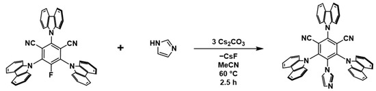 The imidazole-dye compound 1 was prepared by displacement of fluoride in the known precursor 1-fluoro-2,4,6-tri(carbazol-9-yl)-3,5-dicyanobenzene by cesium imidazolate in 95% yield (Scheme 1).
