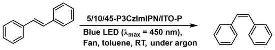 In this experiment, E-stilbene (45.1 mg, 0.25 mmol) was introduced into a custom-made test tube with a magnetic stir bar and polymer 1 on an ITO-NP electrode. Subsequently, the test tube was inserted into a side arm flask, which was connected to a Schlenk line, evacuated, and re-filled with argon for three cycles. Freshly distilled toluene (2.5 mL) was then injected into the test tube using a gas-tight syringe under an argon atmosphere. Upon adding toluene, the resulting solution was stirred at room temperature under blue LED radiation with a fan. To monitor the reaction, 50 μL of solution drawn from the reaction vessel, and 1H NMR spectra were recorded using CDCl3 (deuterated chloroform) as a solvent. 1,3,5-Trimethoxy benzene was added as an internal standard at the end of the reaction.