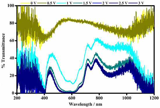 The optical transmittance spectra of the fabricated device at different potentials ranging from 0 V to 3 V registered between 200 and 1200 nm wavelengths.
