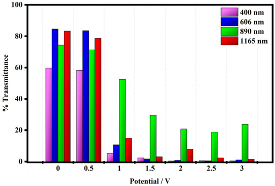 The trends of the variation of the transmittance modulation are plotted in Figure 10 and have been evaluated at maximum contrast wavelength (400 nm, 606 nm, 890 nm, and 1165 nm) i.e., where the device exhibited minimum transmittance in the UV-Vis-NIR region.