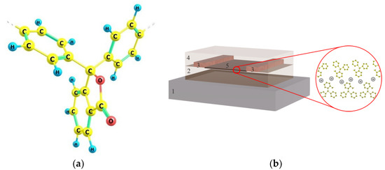 Polydiphenylenephthalide (PDPh) was chosen as the dielectric (Figure 1a). The synthesis of this polymer is described in detail in [36,37]. The temperature of the beginning of softening in air is about 420 °C, and the temperature of the beginning of decomposition ≥440 °C. This polymer is highly soluble in traditional organic solvents: cyclohexanone, chloroform, etc. PDPh is characterized by the following parameters: band gap ~4.2 eV, electron affinity ~2.0 eV, first ionization potential ~6.2 eV. These energy parameters were determined previously for the polymer by different research groups based on the analysis of experimental data [38,39] and quantum chemical numerical experiments [40,41]. PDPh has good film-forming properties at thicknesses of over 2 nm.