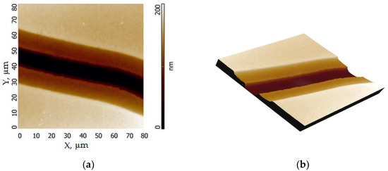 The most difficult stage of creating a multilayer structure is the creation of an extended gap between planar electrodes. In this regard, special attention was paid to the control of manufactured electrodes on the polymer surface. Figure 2 shows the topography of the surface between metal electrodes made of copper and its 3D image. The gap between the electrodes was formed using a wire with a thickness of 15 μm. To align the image, the three-point plane alignment tool was used. The surface of the metal electrode was selected as the base surface. The light area represents the copper surface, the dark area represents the polymer surface. The transition between the surface of copper (light area) and polymer (dark area) is not sharp. The appearance of the intermediate layer is due to the large thickness and cylindrical shape of the wire, which prevents the maximum adsorption of metal on the polymer surface in the area of the gap between the electrodes. This form of mask allows the creation of a thinned electrode directly at the interface of 2 polymer films.