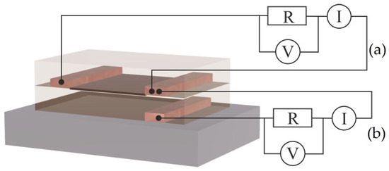 The current-voltage characteristics (IVC) of the quasi-two-dimensional area at the interface of two polymer films were carried out in ambient atmosphere, according to the scheme shown in Figure 3a. The control of conductivity is important in the interpretation of experimental data. For this purpose, before the stage of applying the first layer of polymer, a copper electrode was created on the surface of the substrate under the electrodes embedded in the interface at a distance of 2–3 mm from the gap (Figure 3b).