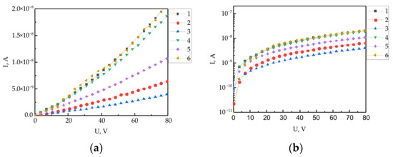 The characteristics have a non-linear form. The sections of the linear dependence with a low potential difference and the regions of superlinear dependence are distinguished. The study of the electrophysical characteristics of experimental structures was carried out on the basis of the injection model of the space-charge-limited current (SCLC) [52,53]. This model has previously been successfully used to study the boundaries of organic dielectrics [17,21,22]. Figure 4b shows the IVC dependencies in semi-logarithmic coordinates. The type of dependence and the slope of the approximating line of all IVC in the range from 20 to 80 V is identical. The differences are most likely caused by the difference in the effective distance between the electrodes. Samples 1, 4 and 6 showed almost identical IVC, which are characterized by the highest conductivity. The further analysis and calculations of the electrophysical parameters were carried out according to the data of the IVC of these three samples.