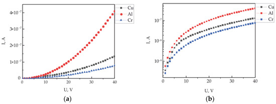 Current–voltage characteristics of the polymer/polymer interface depending on the electrode material (a) and in semi-logarithmic coordinates (b).