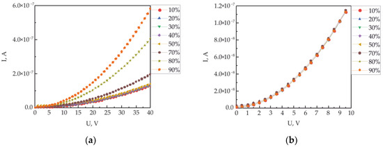 where j is the current density, L is the distance between electrodes, is the voltage of the transition point of linear approximations of these sections in log–log coordinates, n0 is the equilibrium concentration of the charge carriers, is the effective charge carriers mobility, e is the elementary electronic charge, = 8.85·10−12 F·m−1 is the electrical constant, and the permittivity of the material ε at room temperature is assumed to be equal to 2.7 [56]. Hence, equating Formulas (2) and (3), we obtain the expression for concentration: