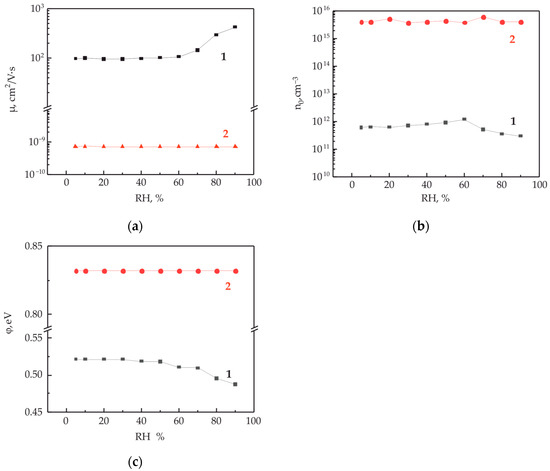 However, the question is about a possible change in the conductivity of the thin polymer film with a change in humidity and, in this regard, the transport of charge carriers not along the interface but through the bulk of the polymer film. To answer this question, an additional electrode was used, which was pre-applied to the substrate under one of the electrodes embedded in the polymer/polymer interface (see Figure 3). Figure 6b shows the IVC measured at different ambient humidities. It can be seen that humidity has a weak effect on the measured IVC. Using these curves, the mobility of charge carriers, the height of the potential barrier and the concentration of charge carriers under the influence of humidity were estimated. These results are presented graphically in Figure 7a–c. No significant changes in these parameters from humidity were detected.