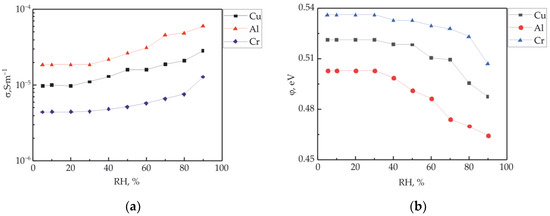 The effect of the electrode material work function on the IVC measured along the polymer/polymer interface at different ambient humidities is investigated. Figure 8a shows the dependences of the electrical conductivity of the experimental samples on humidity with electrodes made of copper, aluminum and chrome. The electrical conductivity was estimated from the IVC corresponding to the Ohm’s region of the current-voltage dependence, that is, for the area of intrinsic charge carriers. The nature of the dependence on humidity shows a nonlinear increase in conductivity for all samples. The results presented in Figure 8a show that the electrical conductivity along the polymer/polymer interface strongly depends on the electrode material. The estimates of the height of the potential barrier at the 3D/2D contact show a decrease in this parameter with an increase in the relative humidity of the environment (Figure 8b). The highest conductivity was registered for the electrode with the lowest work function operation, namely Al, and the lowest conductivity was registered for the electrode with the highest work function operation, namely Cr. In percentage terms, the decreases in the heights of the potential barrier at maximum humidity from the initial value are 7.5% in the case of an aluminum electrode, 6.5% in the case of copper and 5.5% in the case of chromium.