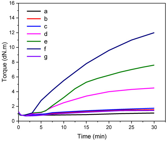 The vulcanization curves of CR with different compounds at 160 °C. (a) CR; (b) CR/CA (1 wt%); (c) CR-2; (d) CR-1; (e) CA-1; (f) DTA-1; (g) CR/DTA(1 wt%).