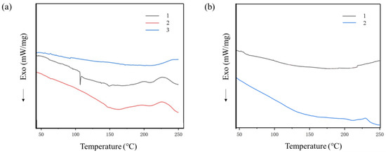 (a) DSC curves of different CR/CA mixtures during heating: (1) CR-2; (2) CA-1; (3) CR/CA (1 wt%). (b) DSC curves of different CR/DTA mixtures during heating: (1) CR/DTA (1 wt%); (2) DTA-1. The arrow means exothermic.