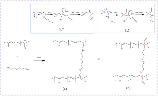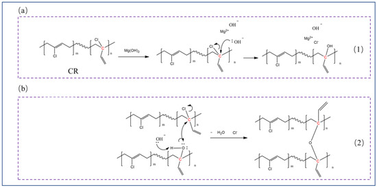 Possible reactions between CR and Mg(OH)2. (a) Reaction 1, the nucleophilic substitution reaction of allylic chlorine groups by groups; (b) Reaction 2, a nucleophilic substitution reaction of allylic chlorine groups by the hydroxyl groups under catalysis of .