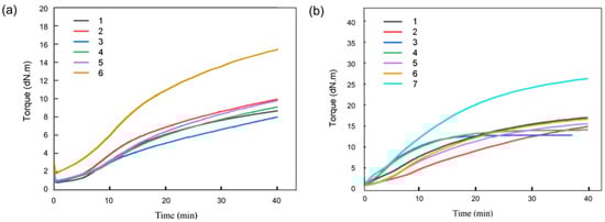 (a) Vulcanization curves of different mixtures containing CA at 160 °C: (1) CA-1; (2) CA-0.5; (3) CA-2; (4) CA-1-15; (5) CA-1-20; (6) CA 1-10-20. (b) Vulcanization curves of different mixtures containing DTA at 160 °C: (1) DTA-1; (2) DTA-0.5; (3) DTA-3; (4) DTA-2; (5) DTA-1-15; (6) DTA-1-20; (7) DTA 1-10-20.