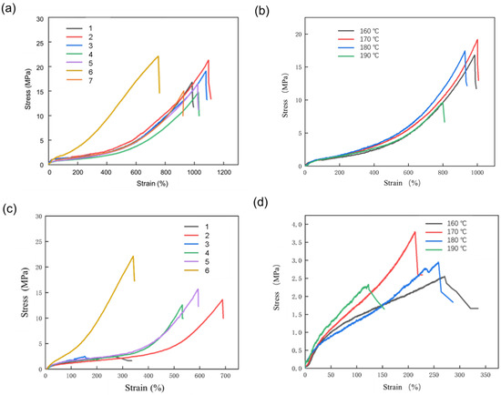 (a) The stress and strain curves of different CR/CA blends at 160 °C: (1) CA-1; (2) CA-0.5; (3) CA-2; (4) CA-1-15 wt%; (5) CA-1-20; (6) CA1-10-20; (7) CR-0. (b) Tensile curves of CA-1 at different vulcanization temperatures. (c) The stress and strain curves of different CR/DTA blends: (1) DTA-1; (2) DTA-0.5; (3) DTA-2; (4) DTA-1-15; (5) DTA-1-20; (6) DTA1-10-20. (d) Tensile curves of DTA-1 at different vulcanization temperatures.