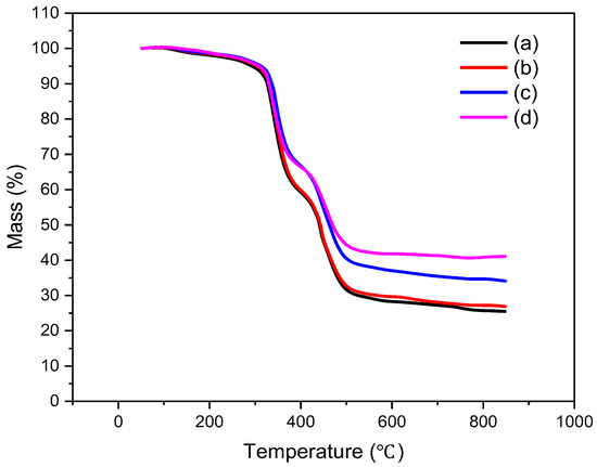 Thermogravimetric curves of different compounds: (a) CA-1; (b) CA-0.5; (c) CA-1-20; (d) CA1-10-20.