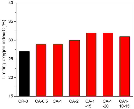 The halogen atoms present along the polymer chain have the ability to capture free radicals produced during the combustion process. The CR polymer chain contains a large number of C–Cl bonds, endowing the CR vulcanizate with flame-retardant properties [36]. To enhance the flame-retardant properties of CR, it is typically essential to incorporate supplementary flame retardants, which facilitate the suitability of CR vulcanizates for applications that demand high levels of flame retardancy. The vulcanization experiment demonstrated that, apart from serving as a vulcanizing agent, also functioned as a catalyst for the reaction between amino groups and allylic chlorine. When the vulcanization formula was initially designed, the role of as a flame retardant was also considered. Therefore, flame retardant performance tests of the CR/CA system were carried out. As shown in Figure 9, all six samples exhibited higher LOI values than the CR-0 sample in the absence of . The flame retardancy of is attributed to the endothermic effect and the dilution oxygen effect of water vapor generated during thermal decomposition. It can be also seen that the LOI of CA-x vulcanizate gradually increased with the increase in content, but the CA content had little effect on the LOI of CR vulcanizate, possibly due to the small amount of CA. Comparing CA-1-10 and CA1-10-20, it can be seen that 20 wt% carbon black slightly reduced the LOI of CR vulcanizate.