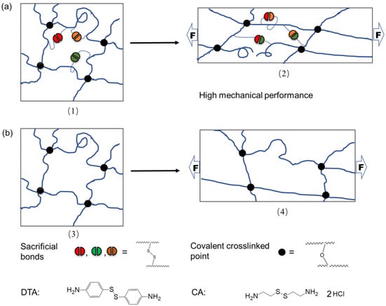 Hydrogel-like bio-tissues, such as tendon [1], silk [2], and byssus [3], exhibit fascinating mechanical properties. It has been widely accepted that the high mechanical abilities of biological materials originate from the dynamics of sacrificial bonding systems: the rupture of sacrificial bonds and the release of hidden lengths dissipate a large amount of energy [4,5]. For example, hydrogen bonds and metal–ligand coordination bonds were found to serve as sacrificial bonds in spider silk proteins [6,7] and mussel byssal threads [3,8], respectively. Inspired by the sacrificial bonding structures in biological materials, various non-covalent bonds, as well as covalent ones, as sacrificial bonds have been engineered into artificial hydrogels and elastomers.
