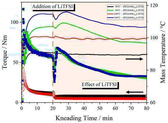 3.2.2. Effect of the Addition of LiTFSI on the Thermal Kneading Behavior of PEO