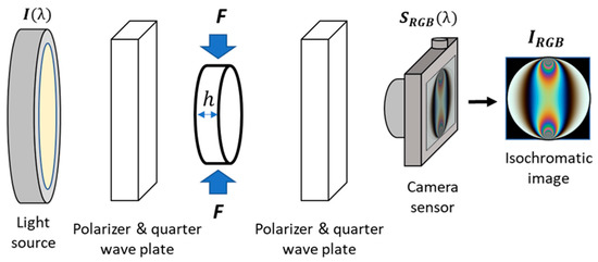 In digital photoelasticity studies, the birefringence of a translucent body can modify the phase of light traveling through it. Such phase delay ‘’ is proportional to the optical properties of the material ‘’, the thickness ‘’, the difference of the principal stresses ‘’, and the wavelength of the light radiation used for the visualization of the phenomenon ‘λ’. This relationship is known in the literature as the stress-optical law Equation (2) and indicates that, for controlled experimental scenarios, stresses could be quantified as a problem whose objective is to measure the phase delay [19]. In those cases, visualizing the phase delay is possible through images with color fringe patterns when the loaded specimen is observed in an optical setup called polariscope, as shown in Figure 2.