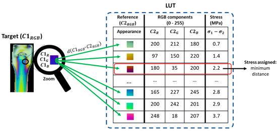 After the stress distribution has been visualized using color fringe pattern images, a demodulation stage is carried out to quantify the stress measurements. In this case, we followed the TFP method. Here, the computational principle consists in search strategies where, for a reference part, each color emerging in the fringes is stored with its respective stress value in a reference color chart called Lookup Table (LUT) [15]. Thus, to decode a new experimental case, each color must be looked up in the LUT. Although the literature on photoelasticity reports several search strategies for TFP, the most common is the Euclidian distance because of its smooth calculation, as shown in Equation (4). There, represents each color in the target image and accounts for each color in the LUT, both expressed in the RGB color space. In addition, , , and are all RGB components of the target color. Likewise, , , and are the RGB components of the reference colors integrating the LUT.